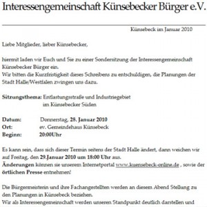 Einladung zur einer Sondersitzung der Interessengemeinschaft Künsebecker Bürger. Sitzungsthema: Entlastungsstraße und Industriegebiet im Künsebecker Süden