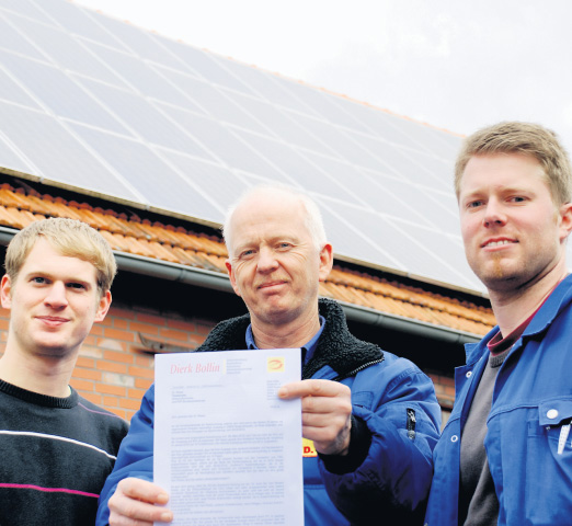 Ärger rauslassen: In einem Brief an den Bundesminister Philipp Rösler beklagt sich Dierk Bollin (Mitte) über das Vorgehen der Bundesregierung in Sachen Photovoltaik. Neben ihm die Mitarbeiter Thorsten Stöwe (rechts, Elektro-Meister) und Marvin Steffen von der FH Bielefeld. Foto: r. feldkirch