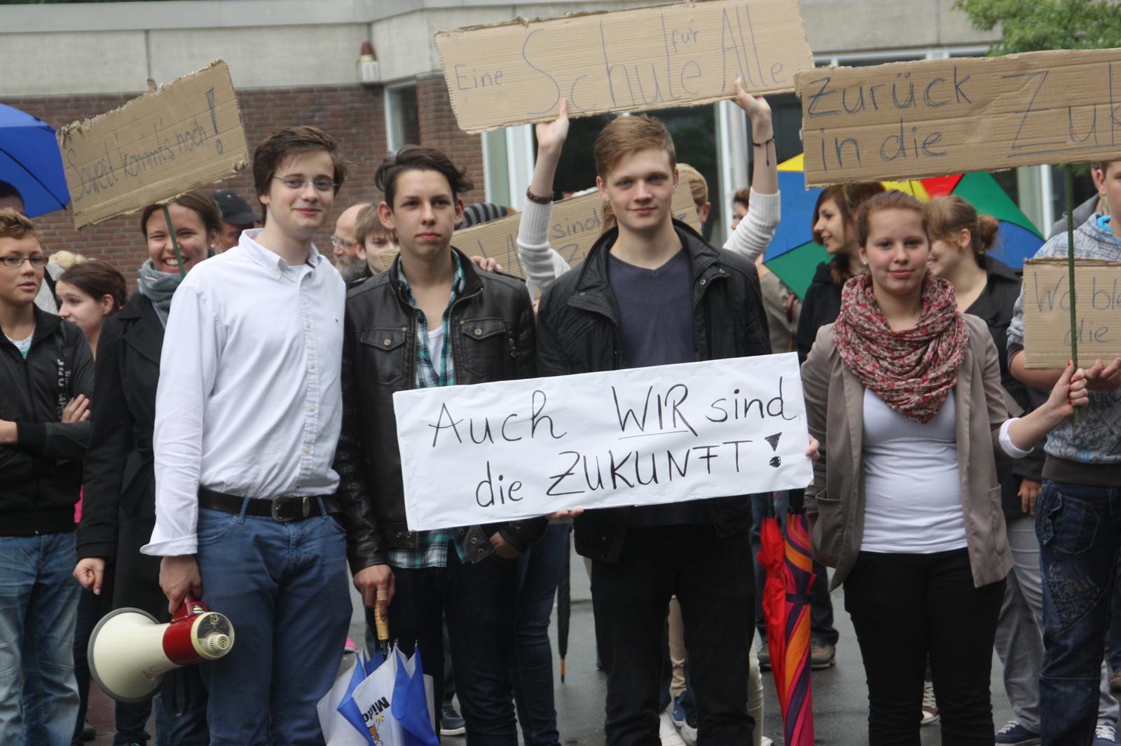 Die Schüler sind am Gebäude ihrer Hauptschule in Versmold los gelaufen und sind in einem Marsch mit Plakaten und lauten Ausrufen zum Rathaus gegangen. Dort wurden sie von Herrn Matthies und Herrn Schmidt empfangen, Maximilian Koch hielt zusammen mit Stefan Hagemeier noch eine Rede um die aktuelle Situation noch mal darzustellen. “Sie sagen, EINE SCHULE FÜR ALLE, dann machen Sie auch eine Schule für alle” sagt Schülersprecher und Veranstalter Maximilian Koch. Herr Matthies hatte die Demonstranten aufgrund des schlechten Wetters in den Vorraum des Rathauses eingeladen. Im Vorraum brachte er Matthies eine kurze Rede zu tragen und Schülersprecher Maximilian Koch überreichte Herrn Matthies die Unterschriftenliste mit über 500 Unterschriften. Ein engagierter Mitstreiter der Demo stellte sehr präzise Fragen darauf hin luden Herr Matthies und Herr Schmidt zu einem Dialog im Ratssaal ein.