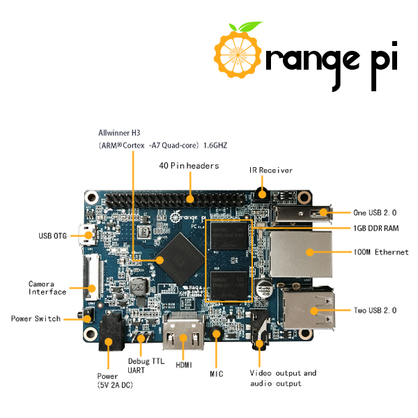 Das Orange Pi Ein-Chip-System vom Hersteller Shenzhen Xunlong Software umfasst ein 1 GByte DDR3-Ram, ein Micro-SD-Speicher-Slot für bis 64GB Daten, Gigabit Ethernet Port, Wireless-N Chip (IEEE 802.11 b/g/n), HDMI/CSI/DSI Port für LCD-Display- und CMOS-Kamera-Ansteuerung, Audio- und Mikrofonschnittstelle, Mali400MP2-GPU@600MHz Grafikkarte, 3x USB 2.0, USB OTG-Port, 40 Pin GPIO Header, Debug TTL UART, IR Empfänger, 5V 2A Stromzufuhr, Power An-/Ausschalter.